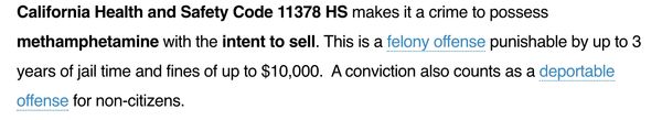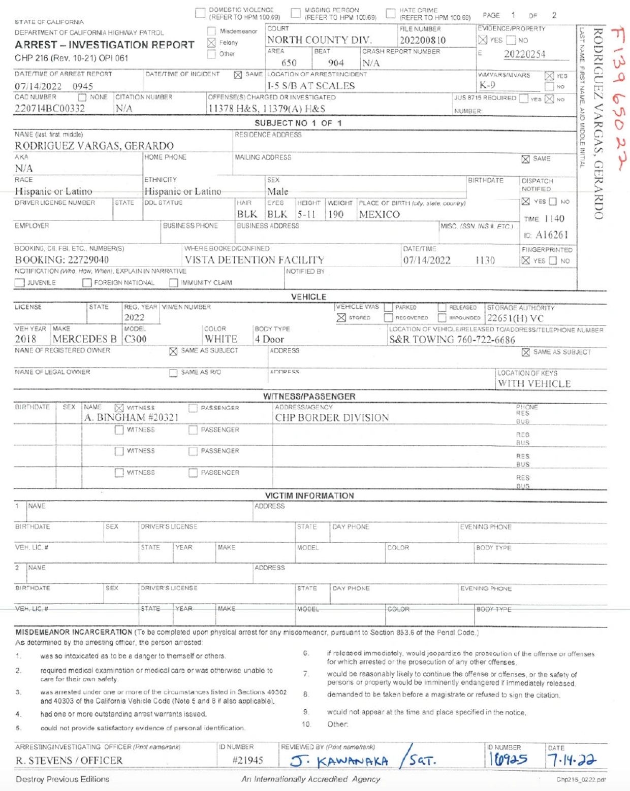 El informe del CHP indica que Gerardo Rodríguez violó 11378 del Código de Salud y Seguridad, lo que hace que sea un FELONIA poseer metanfetamina con la intención de venderla.