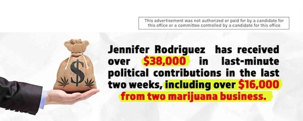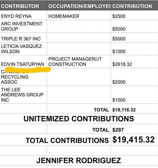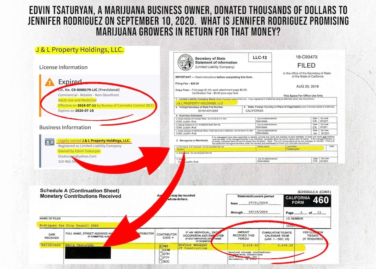 Anuncio político que muestra los formularios de campaña de Jennifer Rodríguez del 2020 que enseñan las contribuciones de Edvin Tsaturyan. También enseña documentos del Secretario del Estado que muestran que el Sr. Tsaturyan es un operador de marihuana.