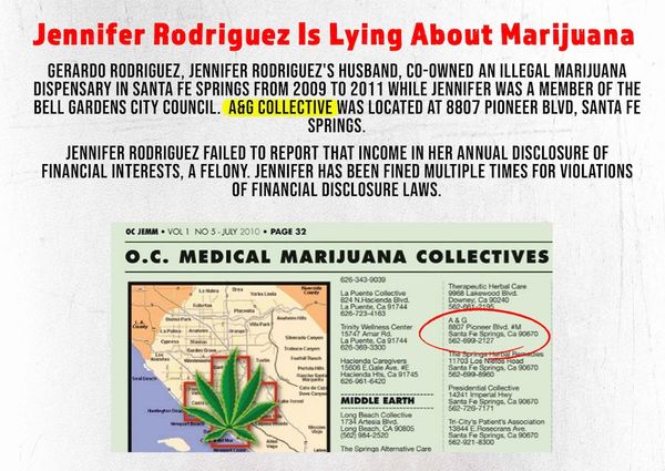 Además de recibir dinero de los operadores de marijuana, la familia Rodríguez tiene un historial de vínculos con el mercado ilegal de drogas. El esposo de Jennifer, Gerardo Rodríguez, era copropietario de un dispensario ilegal de marihuana en Santa Fe Springs. El Sr. Rodríguez compró marihuana semanalmente a un cultivador sin licencia desde finales de 2009 hasta principios de 2011 para abastecer los estantes de A&G Collective ubicado en 8807 Pioneer Blvd. Durante la campaña de 2020 para el cargo, Jennifer se enfrentó a estas acusaciones y no las abordó.