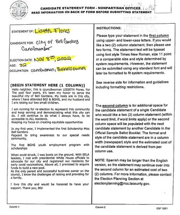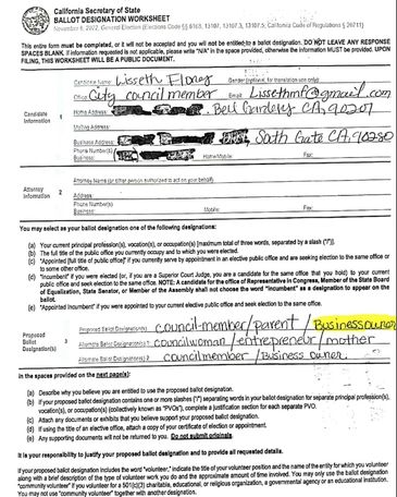 Ballot designation form once again listing Lisseth Flores as a "business owner" while she "worked" as Vice President of her husband's insurance business.