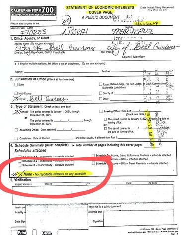 Lisseth's 700 form where she fails to disclose any income from her "business". Elected Officials are required by law to disclose income from any and all businesses, investments, etc.
