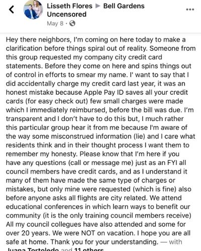 Lisseth Flores was elected to the Bell Gardens City Council in November 2018. In a relatively short period of time Lisseth went on a travel and spending spree charging the city credit card nearly $14,000 on travel and extravagant hotels and hundreds of dollars on meals and Uber Eats.