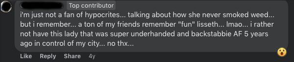 Lisseth claims that drugs are bad for the community and for our youth but people who knew her in high school remember a different opinion on marijuana use from the former councilmember. Pictured is a facebook comment from the Bell Gardens Uncensored community forum from a former classmate pointing out Lisseth's hypocrisy on cannabis use.