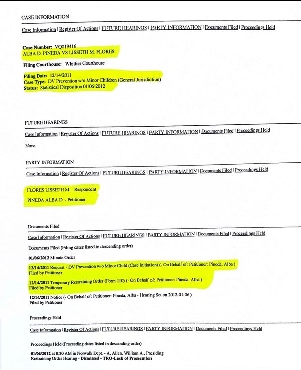 Court filing records naming Lisseth Flores as the respondent/defendant for domestic violence.
